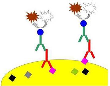 將針對靶標(biāo)的抗體與檢測酶偶聯(lián)。在加入底物時,這種酶催化底物生成有色產(chǎn)物。通過分光光度計(jì)的測定,便可以知道樣品中抗原的濃度。