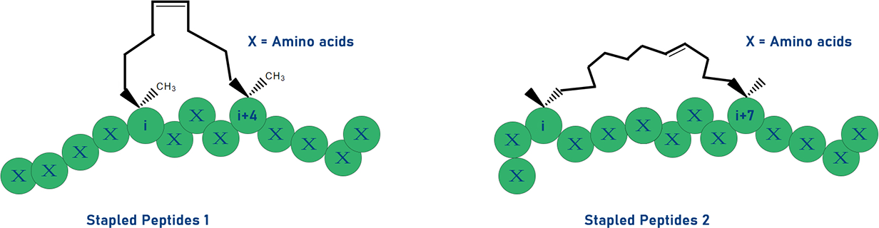Hydrocarbon stapled peptides又稱訂書肽,是在特定位點引入化學交聯的一種全烴化裝訂,將迷你蛋白鎖定在他們的生物活性的α-螺旋構象中的一種多肽環化方式。